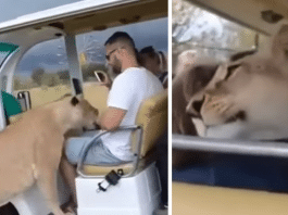 Surpreendente encontro: leoa ‘invade’ carro de turistas e age como gatinho...
