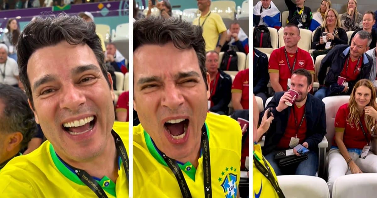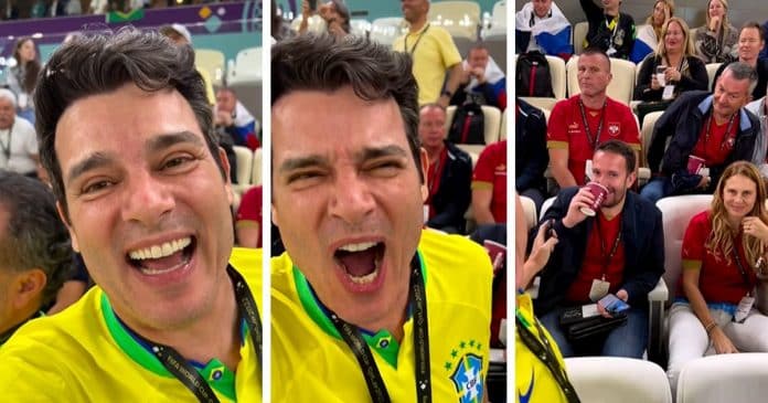 O apresentador Celso Portiolli esteve pessoalmente no Qatar para assistir o primeiro jogo do Brasil na Copa do Mundo, contra a Sérvia. Em suas redes sociais, ele publicou um vídeo onde aparece ‘tirando onda’ com um sérvio após um dos gols de Richarlison, mas a reação do colega de arquibancada é surpreendente.
