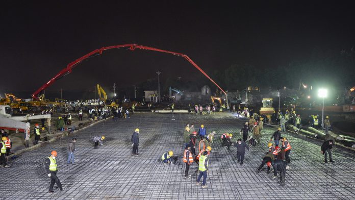Imagens da emissora estatal chinesa CGTN mostraram dezenas de tratores nivelando o solo para receber os blocos pré-fabricados. Enquanto os primeiros módulos eram montados, operários preparavam a rede elétrica do novo local.