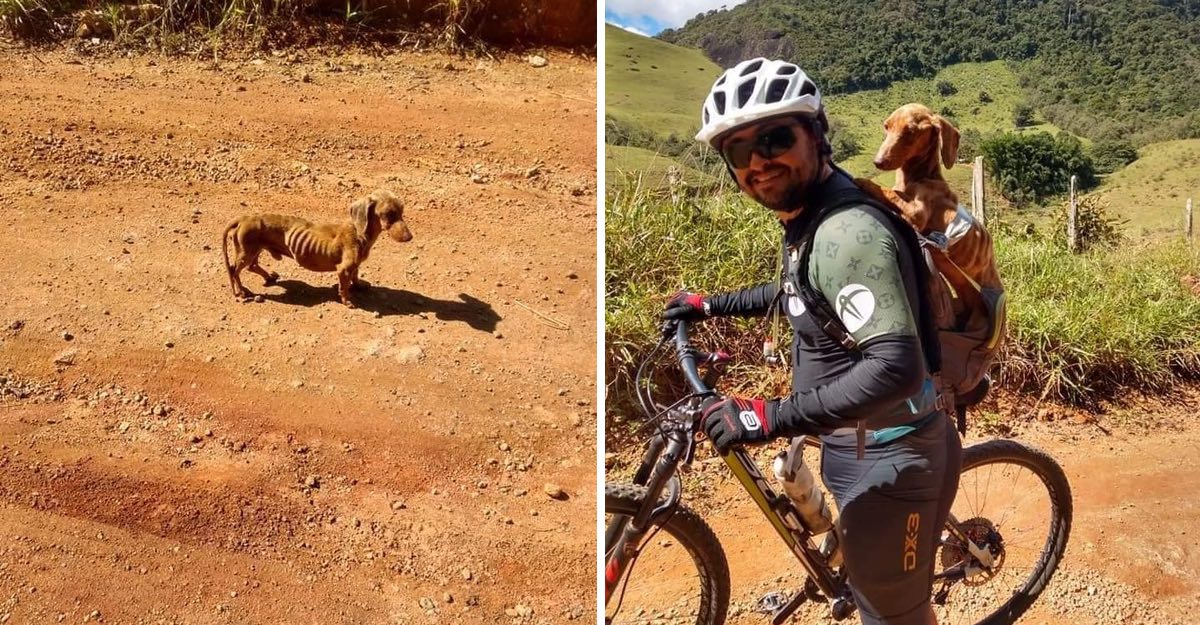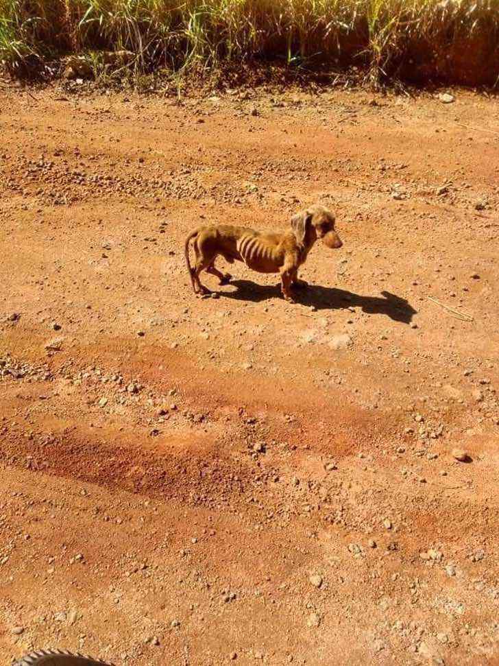 O “cachorrinho salsicha” ou bassê estava com fome e abandonado no meio de um lugar árido e estéril, onde o ciclista o salvou. Se não fosse por esse herói ele provavelmente teria morrido em poucos dias por não ter comida ou água por perto. Este homem o pegou, para depois alimentá-lo e hidratá-lo.