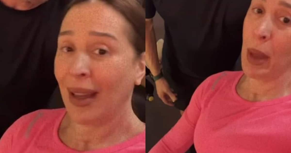 “Olha gente, não ta fácil não, agora que dia que foi fácil, amor? tamo aqui eu e o bebê”, disse a mãe de Enzo e Sophia enquanto fazia um treino de pernas pernas.