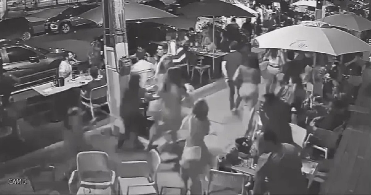O vídeo primeira mostra uma mulher correndo e olhando para trás, no meio da calçada. Há várias mesas e guarda-sóis no local, que estava cheio de clientes.