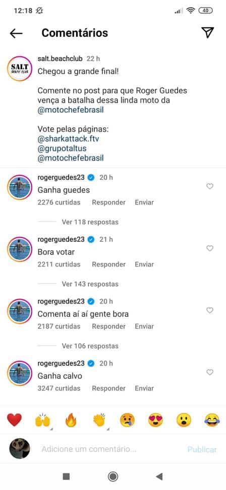 Roger já havia chamado a atenção dos seguidores pelos pedidos inusitados para ganhar a promoção. “Ganha calvo” foi um dos comentários mais curtidos do atleta.