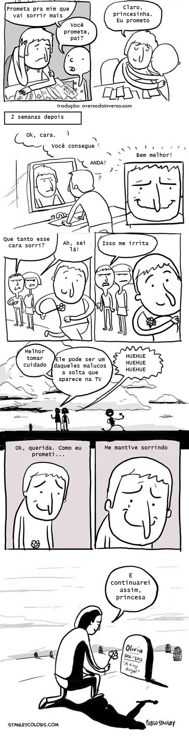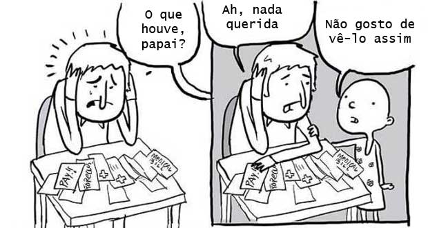 Nessa tirinha, o artista Pablo Stanley trabalha a questão da tentativa de um pai cheio de problemas e profundamente triste, de tentar atender ao desejo da filha.