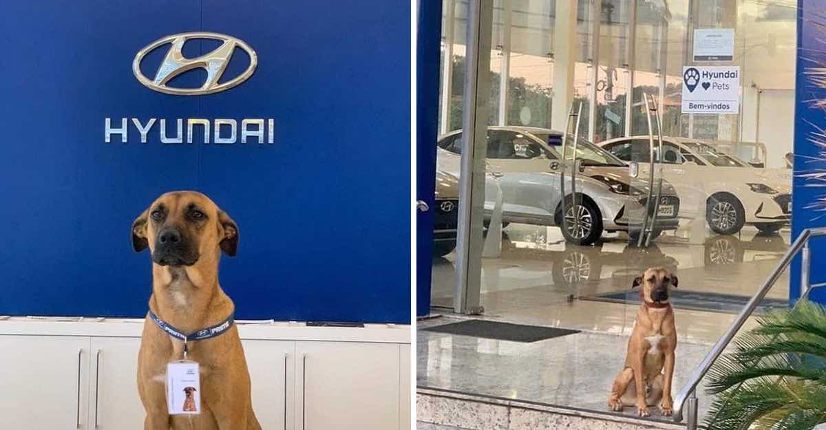 “Esse cachorro passava todos os dias do lado de fora da agência da HYUNDAI pedindo comida, até que um dia os trabalhadores decidiram admiti-lo como integrante da equipe. Agora ele usa um crachá da empresa, com sua foto e tudo. Ele dorme e come no trabalho. Que gesto legal!”