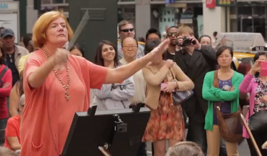 Organizado pelo grupo Improv Everywhere, uma orquestra foi convidada a se posicionar em uma praça no centro de Nova York, esperando por um maestro voluntário que passasse pelo local.