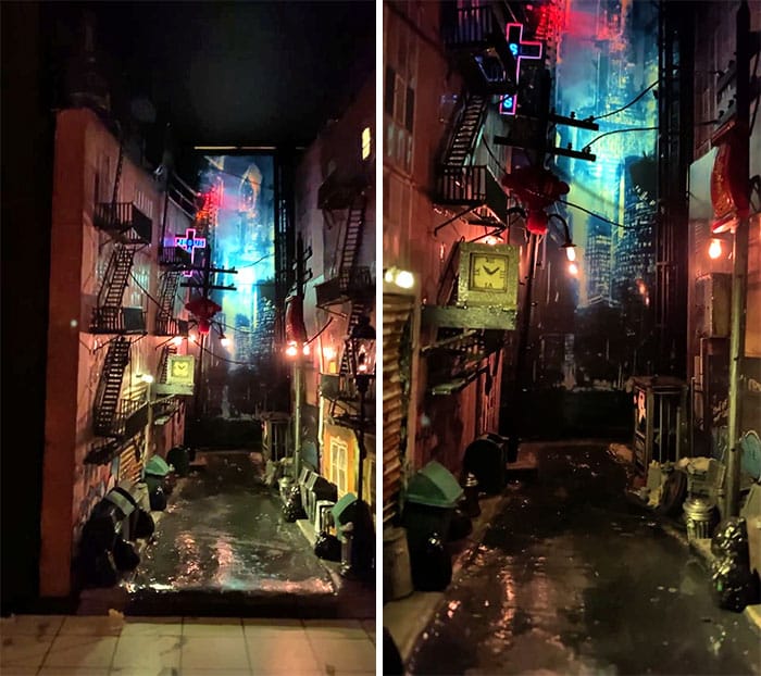 1. Uma miniatura de um beco de uma cidade grande, com inspiração em Blade Runner.