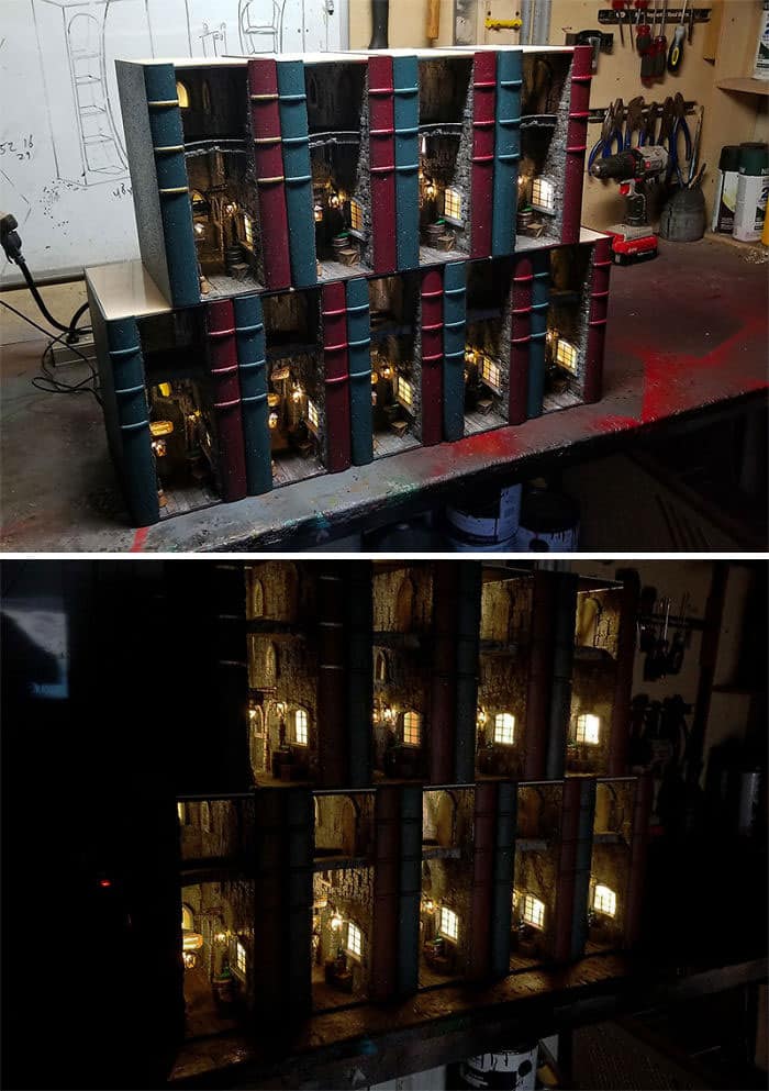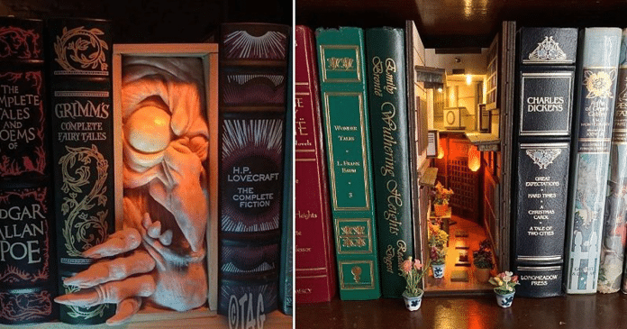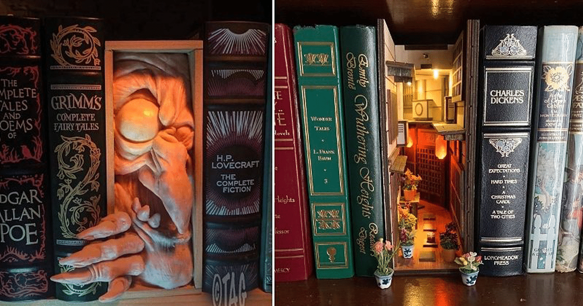 Esses livros decorativos também são chamados de book-nooks e dão um charme mais do que especial para as estantes de livros. Desde pequenas casas do Hobbit, mundos inspirados em Blade Runner e reinos de contos de fadas, as possibilidades são infinitas para essas maravilhosas invenções.