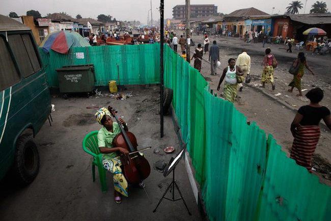 A foto foi tirada em 23 de julho de 2010. Nela, Joséphine Nsimba Mpongo, 37, pratica o violoncelo no bairro Kimbanguiste de Kinshasa, República Democrática do Congo. Ela é um dos membros da Orchestre Symphonique Kimbanguiste (OSK). Durante o dia, Joséphine vende ovos no principal mercado de Kinshasa, a noite ensaia com a orquestra. A OSK foi fundada pelo seu atual maestro Armand Diangienda em 1994. Inicialmente, apenas algumas dezenas de músicos dividiram o pequeno número de instrumentos que tinham à sua disposição. Hoje, a OSK pode reunir 200 instrumentistas para um concerto. A maioria são amadores autodidatas que possuem trabalhos bastante simples durante o do dia.