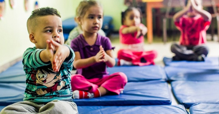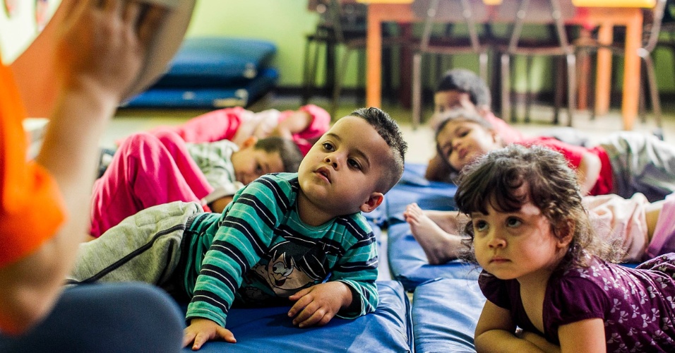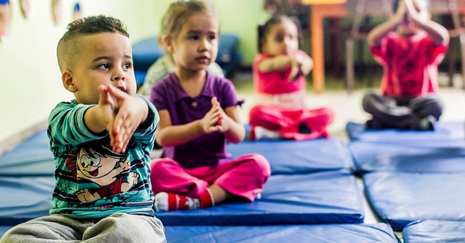 Ao som de mantras, a professora fecha as cortinas e reduz a iluminação dentro da sala. No chão, eles relaxam em colchonetes dispostos um ao lado do outro. Poderia ser uma aula de ioga em qualquer estúdio especializado, mas os alunos têm cerca de 3 anos e a prática acontece em uma creche conveniada à rede municipal de ensino de São Paulo.