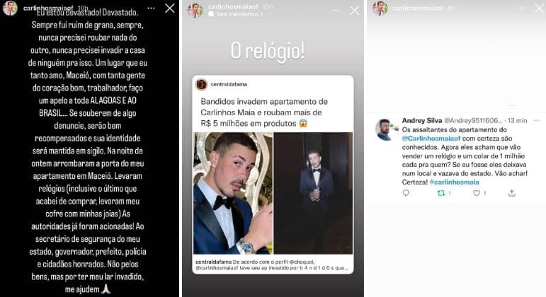 Carlinhos ainda disse que está muito abalado com a situação e anunciou uma recompensa a quem ajudar a identificar os assaltantes.”Eu estou devastado! Devastado. Sempre fui ruim de grana, nunca precisei roubar nada do outro. Nunca precisei invadir a casa de ninguém para isso. Um lugar que eu tanto amo, Maceió, com tanta gente de coração bom, trabalhador, faço um apelo a toda Alagoas e ao Brasil… Se souberem de algo, denunciem. Serão recompensados e sua identidade será mantida em sigilo”, disse.