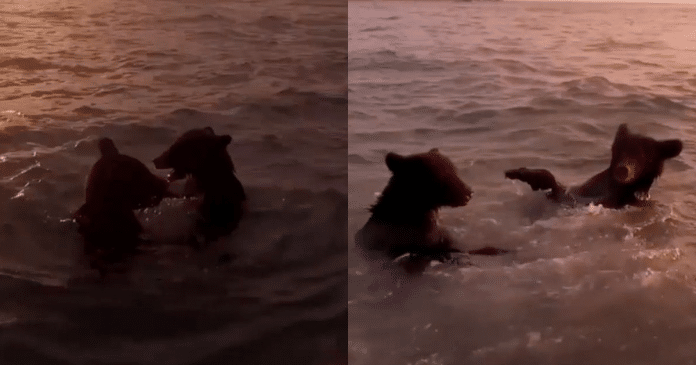 Dois ursos foram flagrados tomando banho no mar, eles aproveitaram o pôr do Sol e uma tarde inesquecível