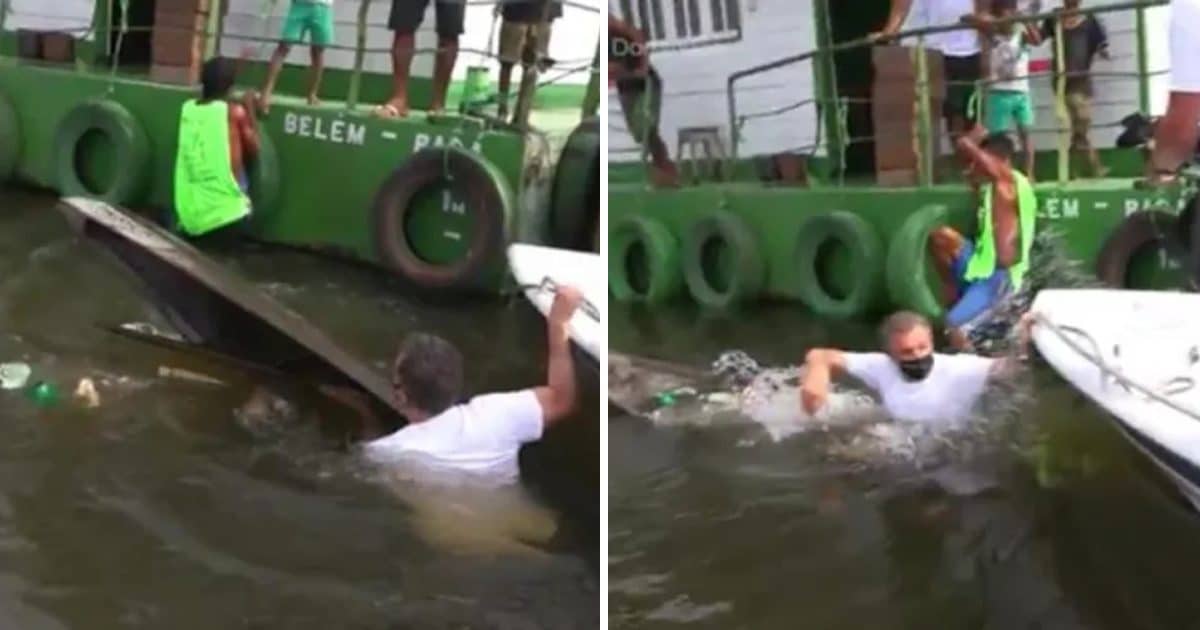 No momento em que o apresentador entrou na canoa, ela afundou. O ribeirinho subiu rapidamente em uma construção que estava ao seu lado, e Huck se segurou no barco da equipe.