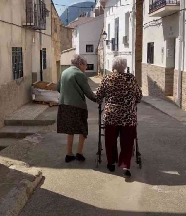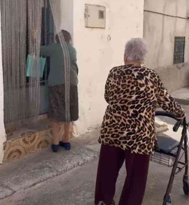 Essas amigas de longa data têm o hábito de se encontrarem diariamente para desfrutar de refeições juntas. A avó vai até a casa de sua amiga, aguardando-a com um sorriso radiante ao vê-la saindo com cuidado de sua residência.
