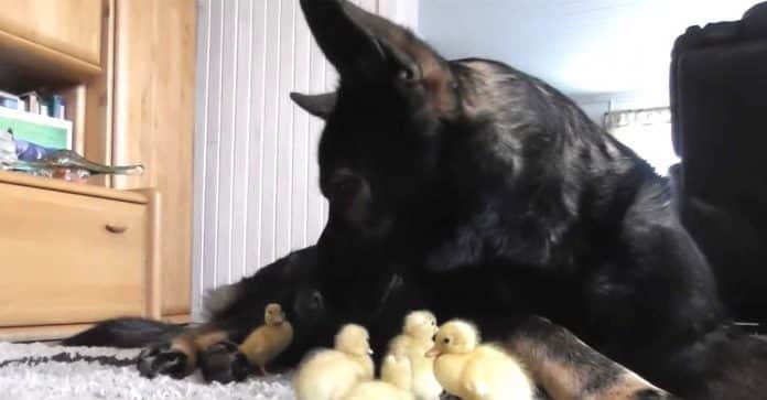Como é o caso do adorável pastor alemão Thorin que depois de conhecer seus adoráveis irmãos de penas, patos indefesos recém-nascidos, reagiu da maneira mais comovente e carinhosa possível.