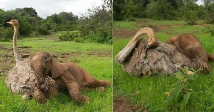 A solitária avestruz imediatamente se identificou com os elefantes e passou a andar com o rebanho, como se fosse uma deles.