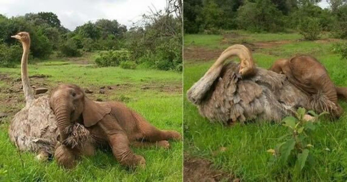“Não estamos mentindo quando dizemos que essa avestruz órfã definitivamente acredita que faz parte da manada de elefante. O pequeno Jotto está mais do que feliz com isso.