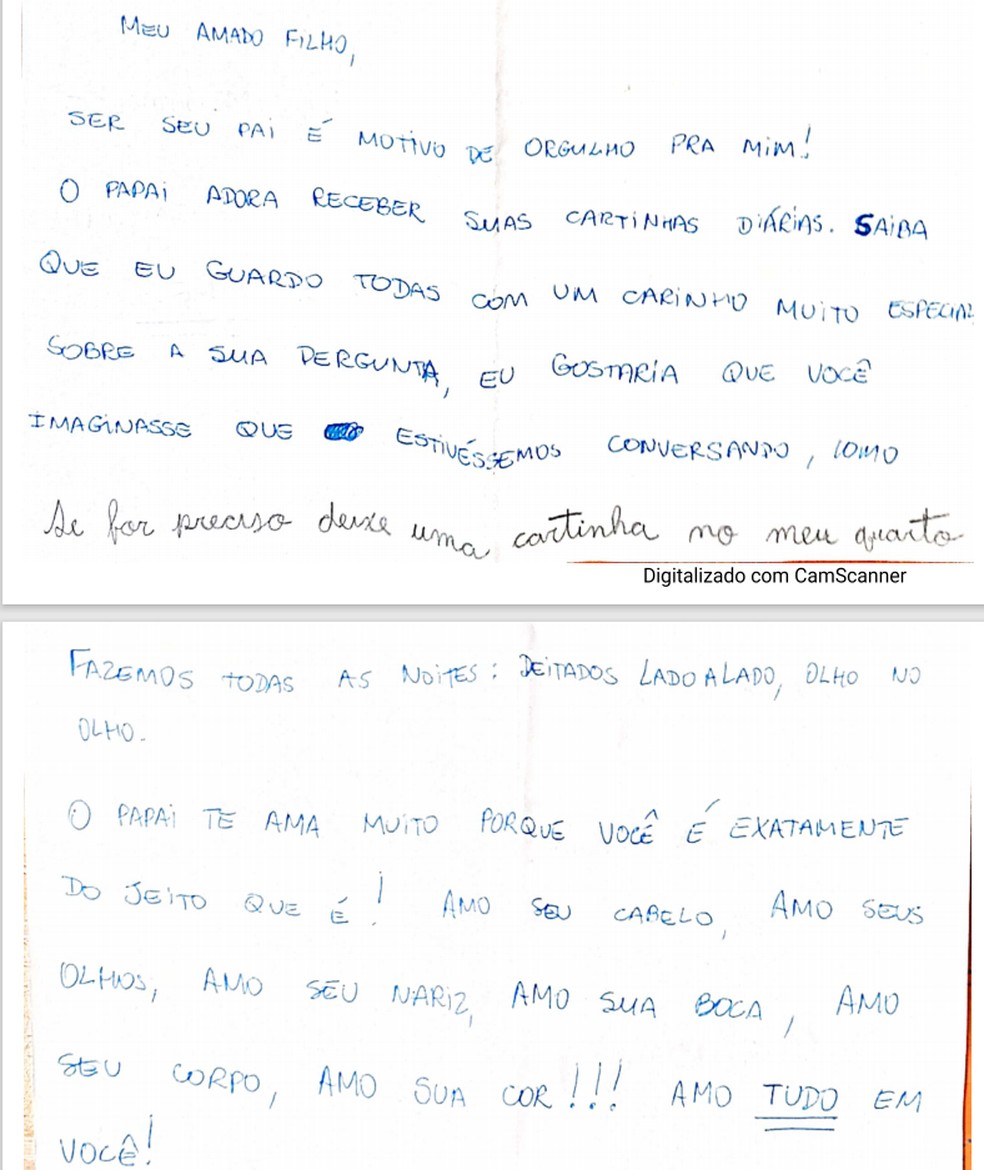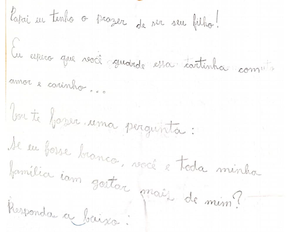 “Ele me disse que tinha recebido minha carta de volta e tinha ficado emocionado com a minha resposta.”, contou o pai. “A sociedade vem fazendo um estrago com esse racismo estrutural, anular emocionalmente uma criança dessa forma é cruel demais”.