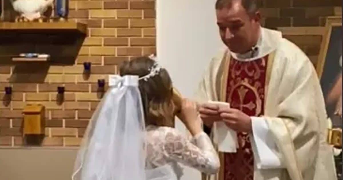 Nas imagens, a menina aparece em frente ao padre. Ele diz: “Corpo de Cristo” e lhe oferece a hóstia. Em seguida, ele entrega um cálice de vinho e diz: “Sangue de Cristo”, esperando que a menina tomasse apenas um “golinho” da bebida.