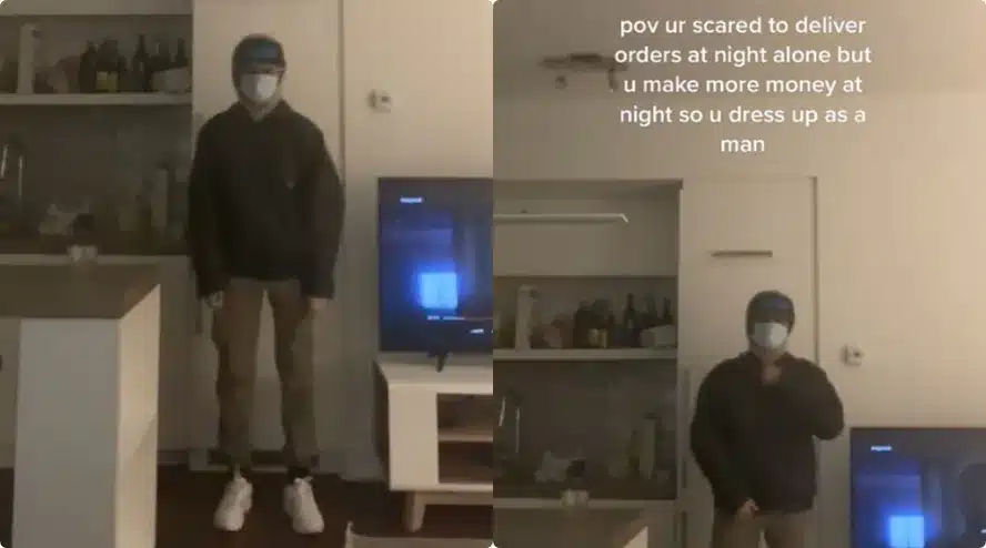 A entregadora da Uber Eats Tia Zakher, residente em Montreal, Canadá, recentemente compartilhou um vídeo no TikTok que gerou grande repercussão. No vídeo, que já acumula mais de 200 mil visualizações, Tia aparece vestida com roupas masculinas, composta por um moletom cinza, uma jaqueta oversized, calça cáqui e tênis branco. Ela também usa um boné, capuz e máscara para ocultar parte de seu rosto. O motivo por trás desse disfarce surpreendente é a sensação de insegurança que as entregadoras noturnas enfrentam.