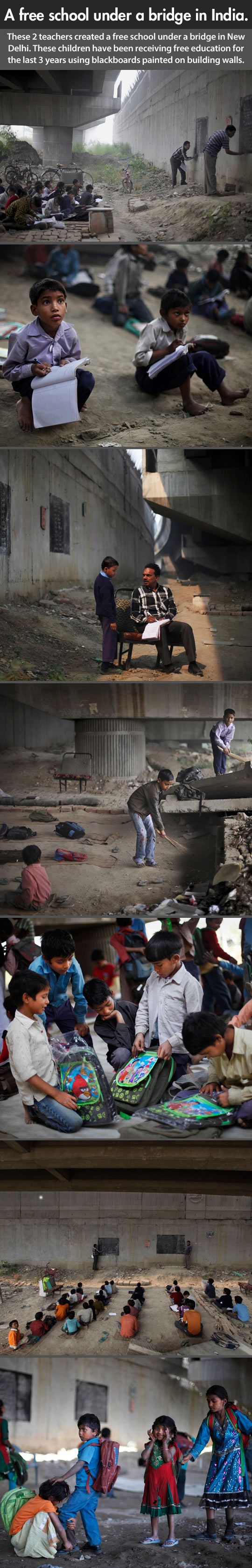 Assim surgiu, sob uma ponte do metrô de Nova Délhi, uma escola gratuita que tinha como objetivo educar as crianças carentes das proximidades.