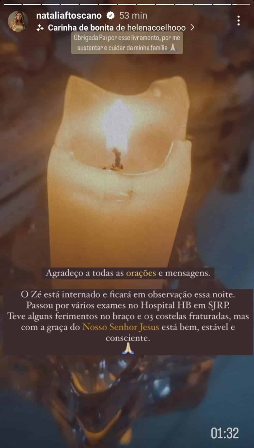 A influenciadora Natália Toscano, de 32 anos de idade, esposa do cantor sertanejo Zé Neto, de 33 anos, da dupla Zé Neto & Cristiano, se pronunciou nas redes sociais sobre o grave acidente sofrido pelo marido, na noite de terça-feira (5). Em sua conta no Instagram, ela postou uma imagem de uma vela e um texto religioso.