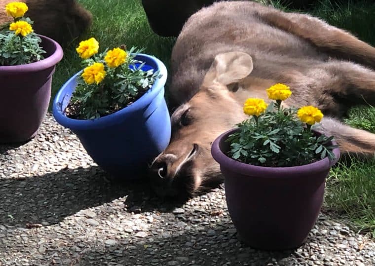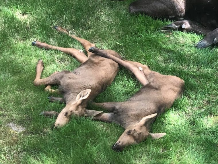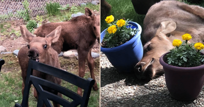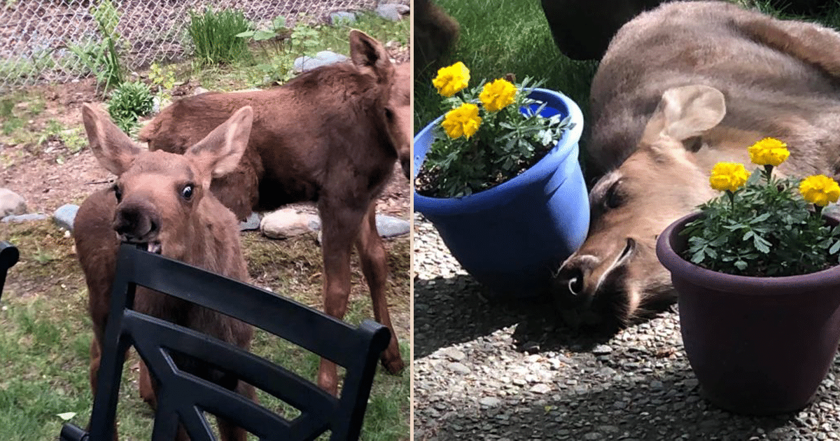 Os animais, não tão pequenos, se interessaram por tudo, desde as cadeiras até os portões e, quando perceberam que o quintal era um local seguro, se aconchegaram e até tiraram uma soneca. A certa altura, a mãe alce até mesmo deu um almoço aos bebês.