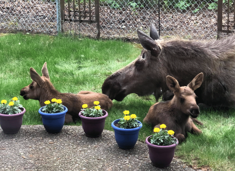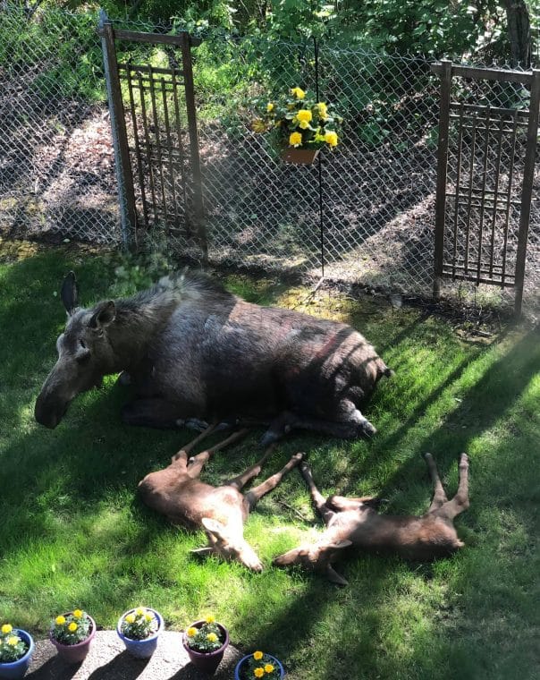 Roland Rydstorm, de Anchorage, no Alaska, ficou bastante chocado quando olhou pela janela na semana passada. Ele recebeu alguns visitantes inesperados e super exóticos. Uma mamãe alce e seus dois filhotes se sentiram atraídos pelo quintal de Roland e então decidiram dar uma passadinha.