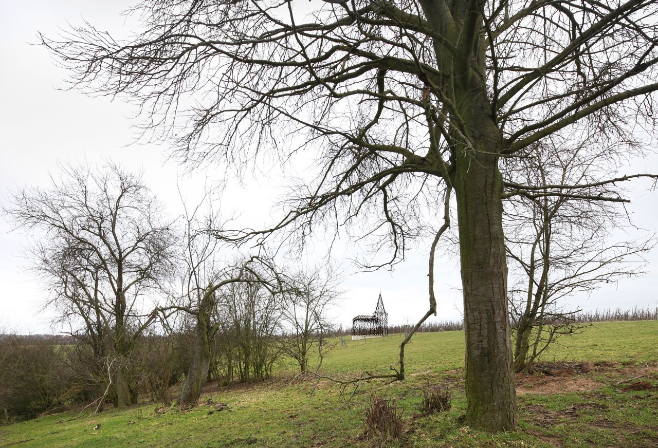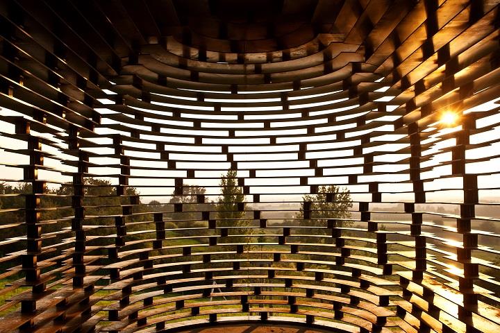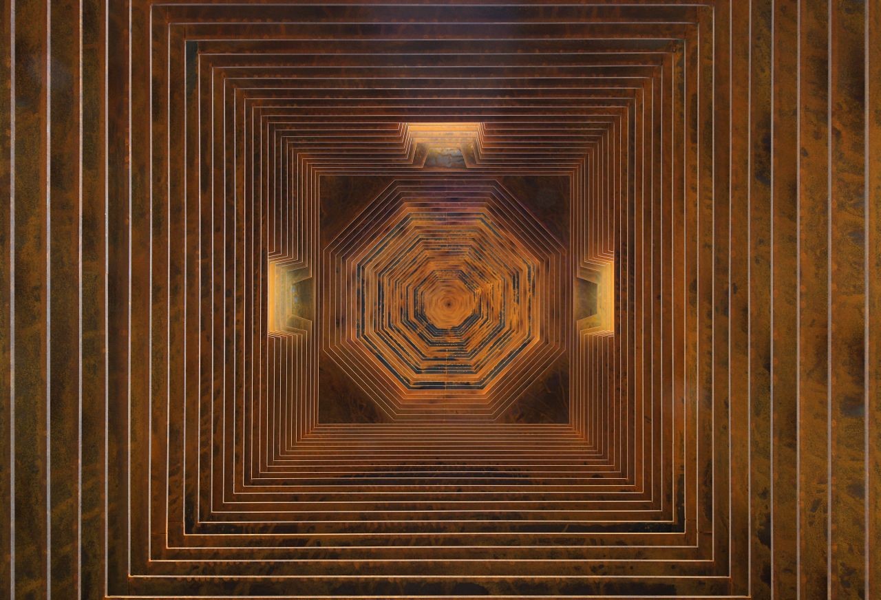 A obra, construída em 2011, utilizou 30 toneladas de aço divididos em 100 camadas de empilhamento minuciosamente estudado para promover o efeito ilusório e transparente almejado
