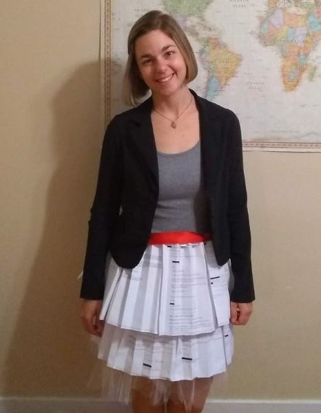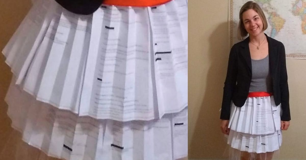 Para fazer a vestimenta, Caitlin Kirby, de 29 anos, imprimiu 17 de suas cartas de rejeição – de bolsas de estudo, jornais acadêmicos e conferências – e dobrou cada uma em um leque. Ela as conectou com uma linha e, no final, tinha um item que lembrava uma saia.