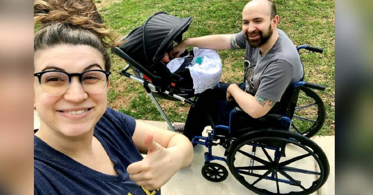 Poucas semanas depois do nascimento do filho do casal, Phoenix, Jeremy conseguiu levá-lo para passear com o híbrido carrinho de bebê e cadeira de rodas.