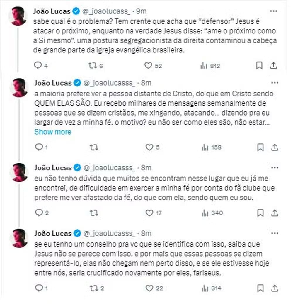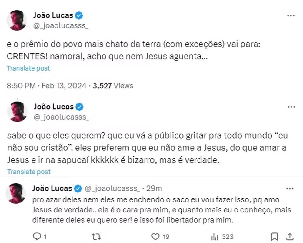 “E o prêmio do povo mais chato da terra (com exceções) vai para: CRENTES! Na moral, acho que nem Jesus aguenta…”, escreveu João Lucas no X, antigo Twitter. O comentário recebeu o apoio de um seguidor: “Não consigo entender….. amar a Cristo não te impede de nada. Você tem que ser justo, fiel a Deus e não fazer o mal, mas eles não entendem”.