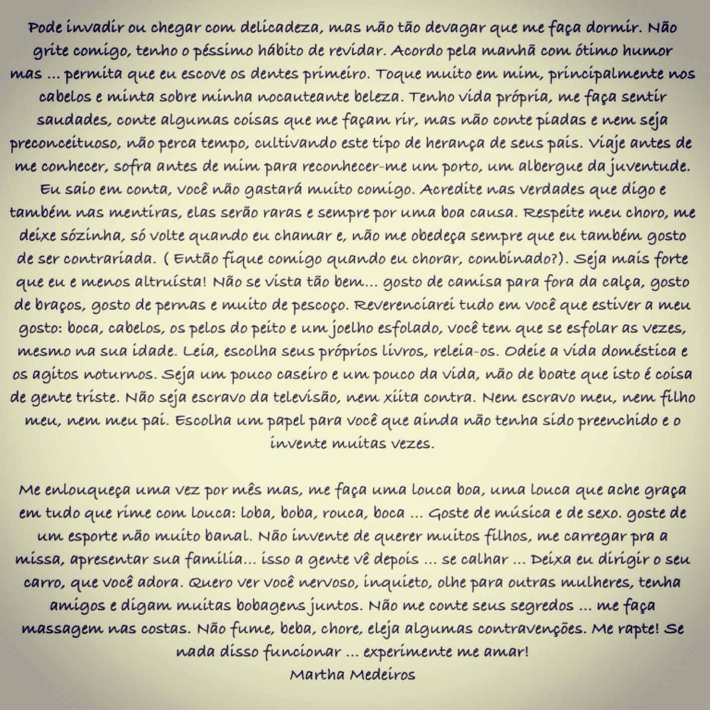 Uma das coisas que mais gosto nos textos de Martha Medeiros é o despojamento e a espontaneidade. O que precisa ser dito, é dito. Nada é calado pois não soaria bem ou porque poderia ofender aos “bons costumes”.
