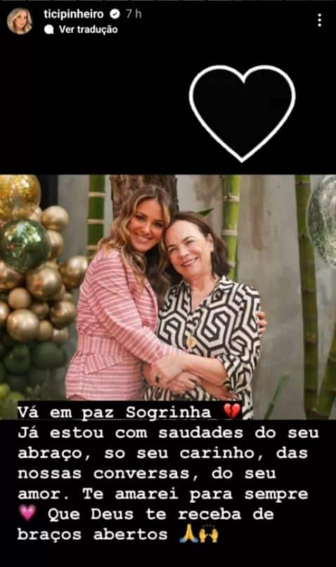 “Vá em paz, sogrinha. Já estou com saudades do seu abraço, do seu carinho, das nossas conversas, do seu amor. Te amarei para sempre. Que Deus te receba de braços abertos”, escreveu Ticiane em um post nas redes sociais.