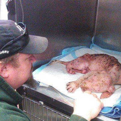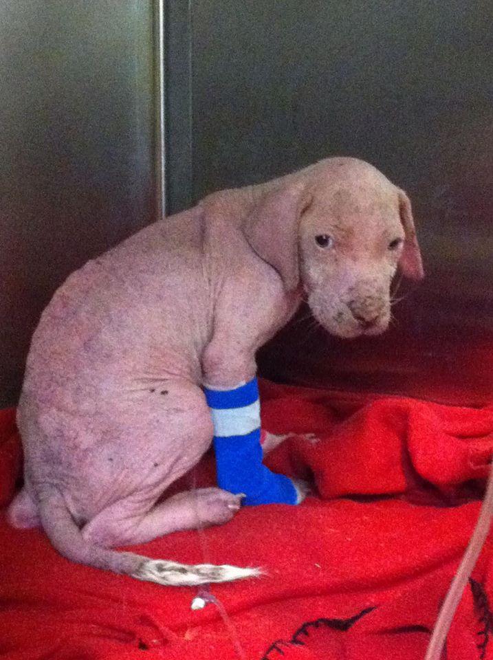 Joey e o resgate levaram o cãozinho para o hospital animal, onde ele foi tratado por desidratação severa e sarna demodécica. Aos 3 meses, ele perdeu todo o pelo e ficou coberto de picadas de ácaros. A desnutrição e as condições de vida deploráveis pioraram sua sarna, e o filhote choramingava de dor enquanto Joey supervisionava seus cuidados.
