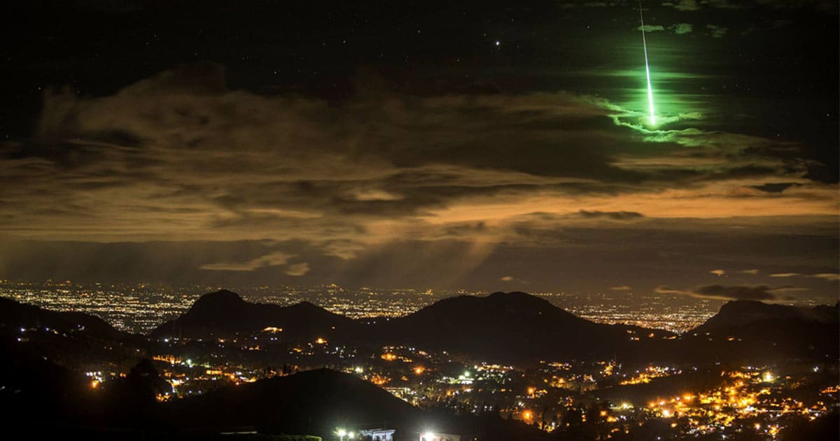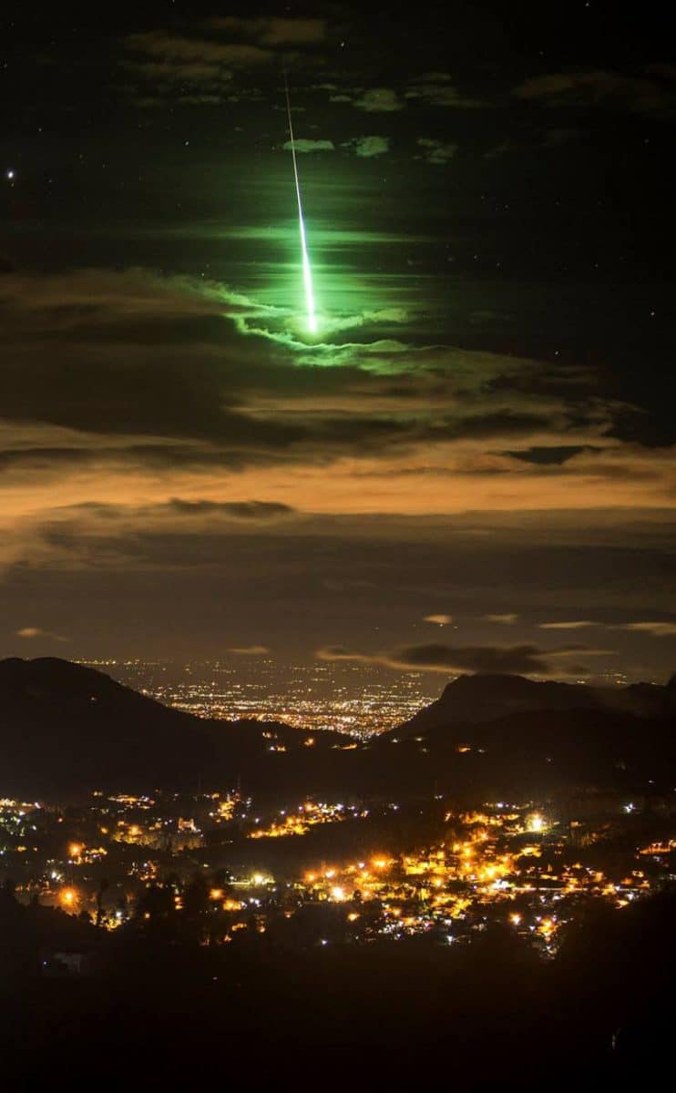Yadav conta que estava dormindo quando o meteoro verde-claro explodiu sobre Mettupalayam, uma pequena cidade na região montanhosa de Ghats Ocidental, no sul da Índia, mas o equipamento que ele montou no topo de uma colina próxima capturou a bela imagem.