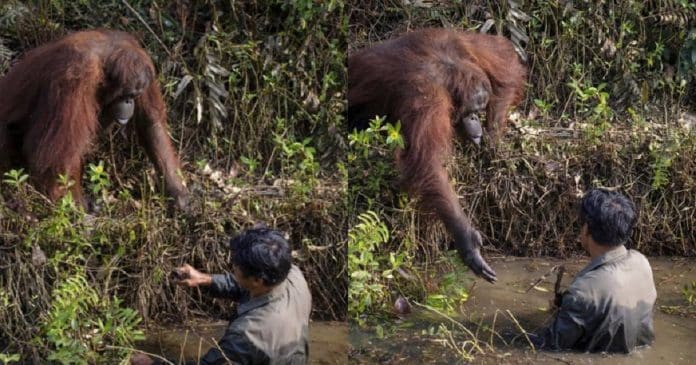 Fotógrafo captura orangotango tentando ajudar um guarda florestal