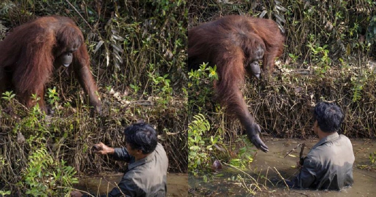 As fotos viralizaram, deixando centenas de milhares de pessoas maravilhadas com o ato de bondade do orangotango.