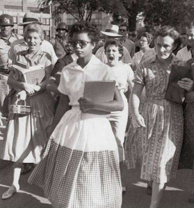Dorothy Counts, a primeira negra a frequentar uma escola publica (de brancos) sendo perseguida em seu primeiro dia de aula.