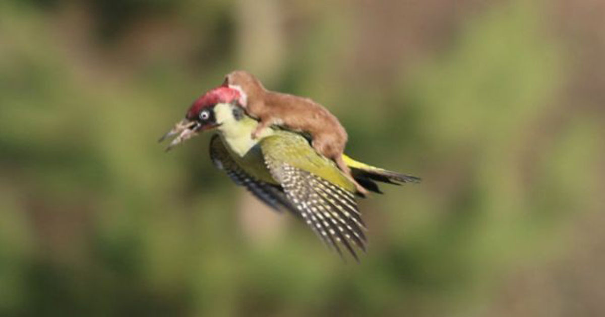 Furão voando de carona em pica-pau é a melhor imagem que você vai ver hoje