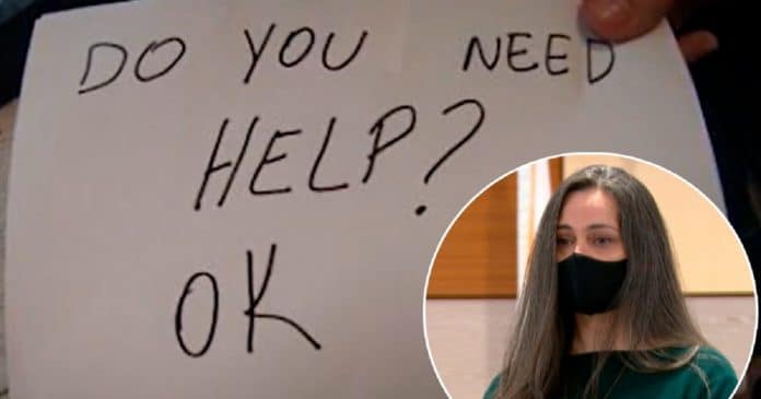 “Eu vi que ele estava com medo ou desconfortável e precisava de ajuda. Minutos depois, eu escrevi um outro bilhete perguntando se ele precisava de ajuda e ele respondeu com a cabeça que ‘sim’. Depois ele cruzou as mãos diante do peito mostrando que não sabia o que fazer. Eu liguei para a polícia e, minutos depois, a polícia chegou e tratou a situação de forma incrível”, finalizou ela.