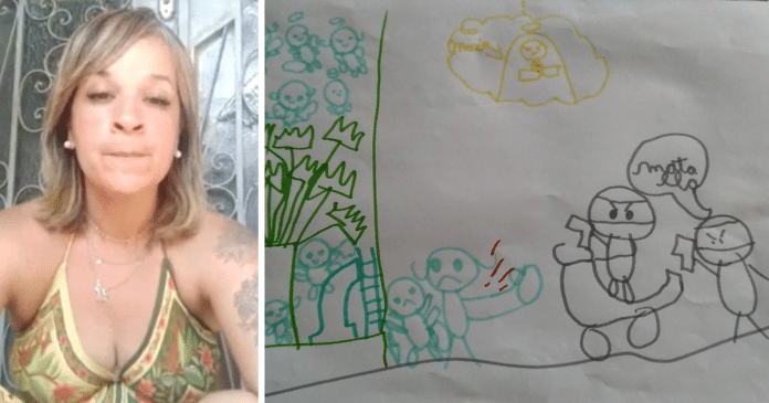 O que as duas não esperavam, é que o menino reproduziria a cena que tinha acabado de viver, em seus desenhos. Nas folhas de papel, ele desenhou a mãe com as mãos para o alto, sendo rendida pelos assaltantes. Além do momento em que um dos homens ordenava ao comparsa: “Mata ela!”.