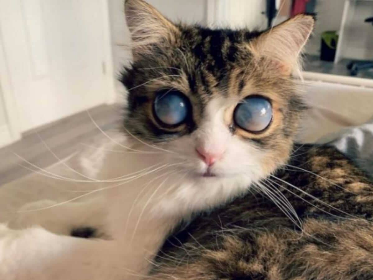 O felino de 9 anos tem glaucoma bilateral, o que fez com que seus olhos verdes se tornassem duas esferas nubladas que se parecem com bolas de cristal.