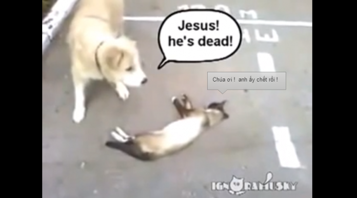 Um mecanismo de defesa para sobrevivência de muitos animais é a imobilidade. Nesse vídeo, um gatinho muito esperto finge-se de morto para enganar o cão e ganhar tempo antes de fugir. No final, a cena fica muito engraçada. A fuga é digna de um bom filme de ação.