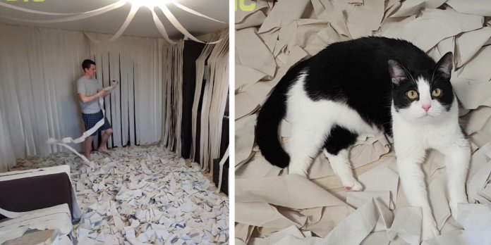 “Descobrimos a paixão de Pusi pelo papel higiênico quando ele era pequeno”, disseram seus proprietários ao site boredpanda. “Ele gostava de brincar com o papel higiênico, mas nós não o encorajamos, pois tentamos manter nossa casa em ordem e ele já tinha muitos brinquedos. No entanto, decidimos recentemente deixá-lo se lembrar de sua juventude e dar-lhe todo o papel higiênico que ele poderia desejar. Cobrimos todo o nosso espaço e tentamos captar a reação dele. ”