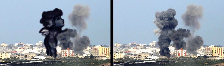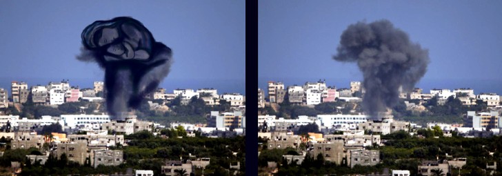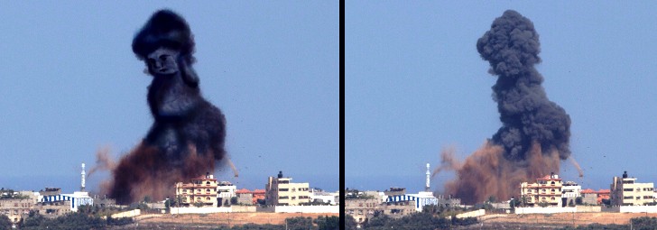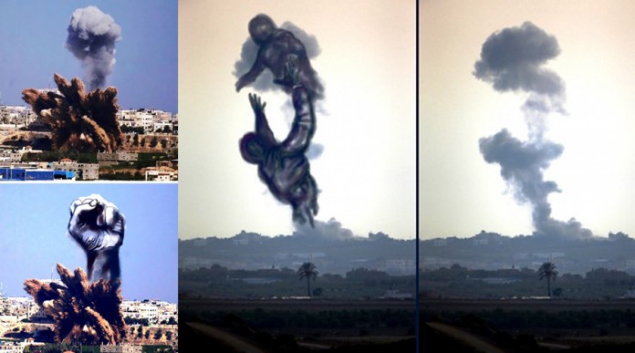 Para isso, ele tira fotos da fumaça provocada por ataques com foguetes, e as transforma em símbolos de esperança e de paz.