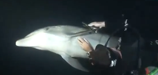 Durante um mergulho noturno no Hawaii, um grupo de mergulhadores percebe a aproximação inesperada de um golfinho que, após algum tempo, mostrou sua nadadeira para um dos mergulhadores que pôde perceber um anzol e linhas de pesca que o estavam machucando. Keller, o mergulhador, entendeu o pedido de ajuda do animal e começou a soltar o golfinho que permaneceu calmo e tranquilo enquanto seu salvador o libertava.