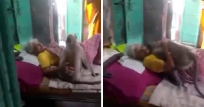 Em um vídeo que viralizou e deu a volta ao mundo, é possível ver uma senhora muito doente e acamada, que recebe a doce visita de um amiga a quem ela tanto amava, o langur cinza que ela costumava alimentar.