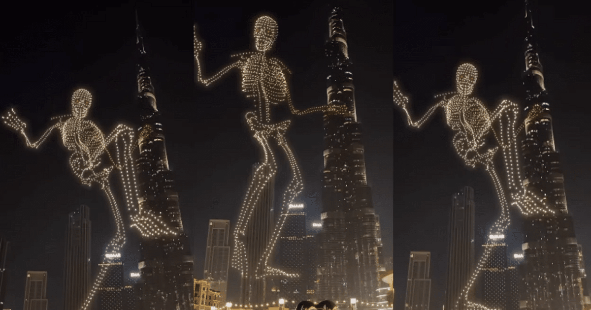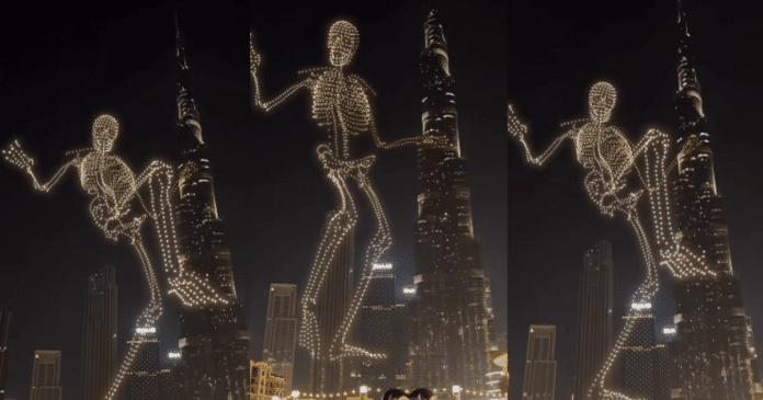 Um vídeo viral gravado durante o Geoscan Drone Show captura o espetáculo assustador da perspectiva dos visitantes, que viram uma formação semelhante a um gigante “esqueleto móvel” flutuando no ar próximo ao arranha-céu no centro de Dubai.