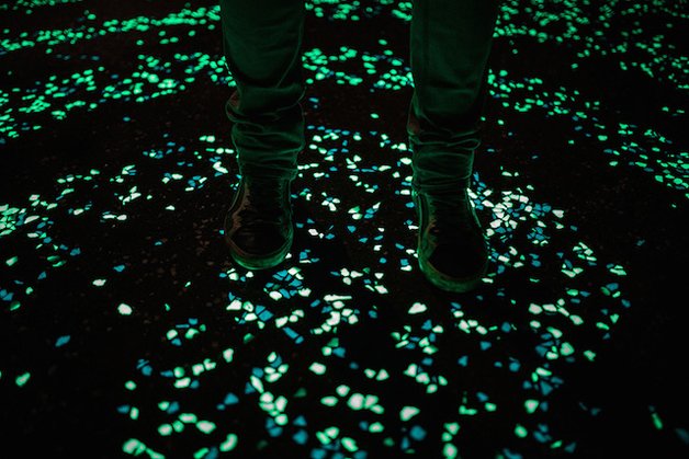 Na ciclovia, ciclistas pedalam à noite sobre um chão que brilha. O efeito deslumbrante é resultado de um projeto feito com peças de um material que traz pequenas luzes de LED. O artista responsável pelo projeto, Daan Roosegaarde, explica que a sua ideia era criar um lugar em que as pessoas pudessem ter uma experiência especial.